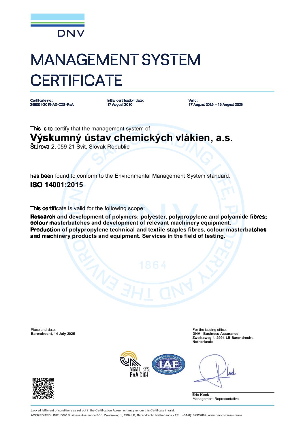 Current certificates of quality and environmental management are according to standards ISO 9001: 2015 and 14001: 2015. Certificates were issued by DNV – Business Assurance, and are valid until 16.8.2025 for the following areas: